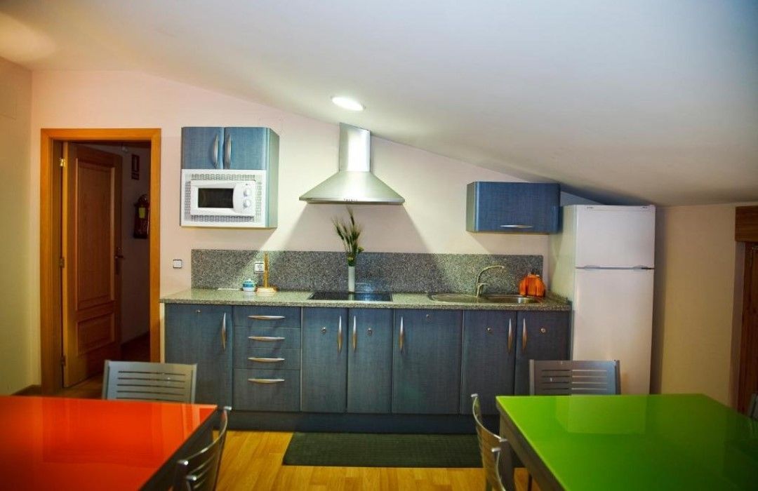 En la plaza del pueblo. Habitaciones y baños grandes y muy limpio. Zona común con una cocina completa con mesas y sillas ideal para calentar comida de niños o desayunar. Personal muy amable, atención rápida. Todo muy bien. Hotel sencillo y pequeño con todo lo necesario.